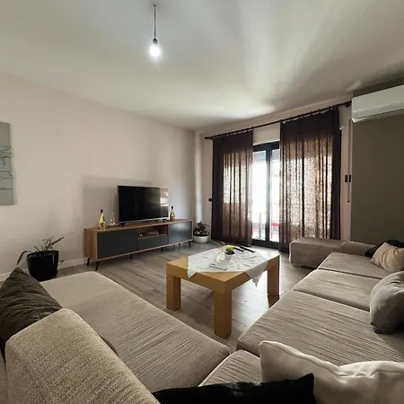 Eine voll ausgestattete Küchenzeile mit einem Kühlschrank, einem Herd und Küchenutensilien gehört zur Ausstattung dieses Apartments für Selbstversorger. Die Bushaltestelle Njesia Kashar liegt ein paar Schritte entfernt von diesem 120 m² großen Apartment.